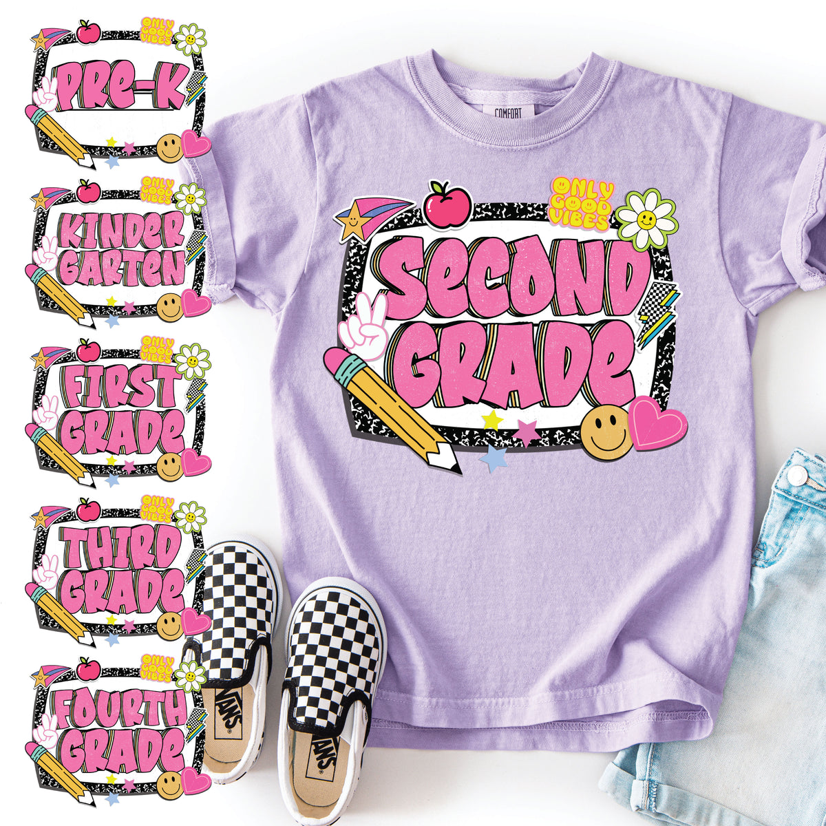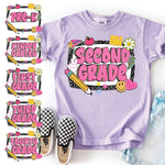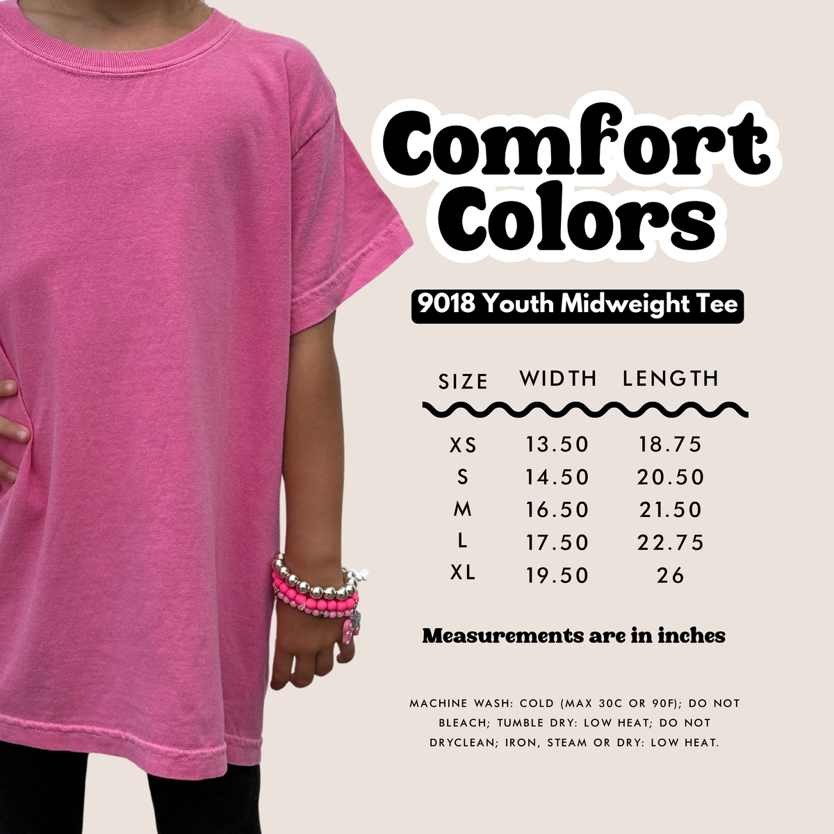DTF printed on a Comfort Colors tee in Orchid! Size chart is listed for reference.