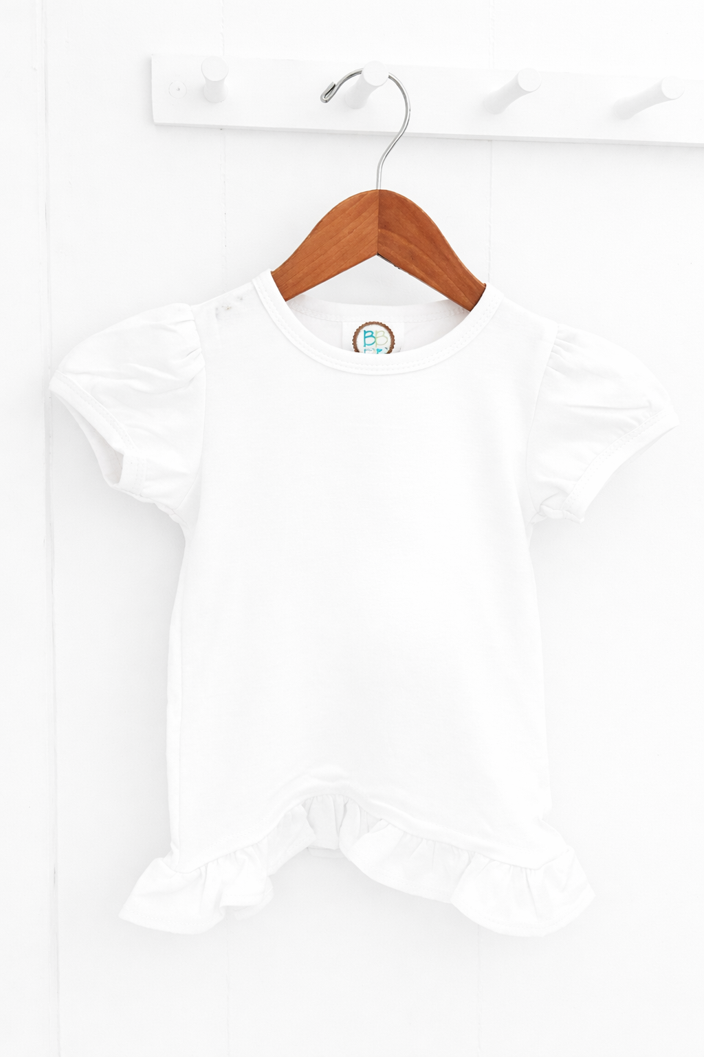 Our best-selling premium cotton knit girls’ tee features a ruffle hem and puffy cap sleeves. Available in sizes 12M–8T. Made with 6+ oz, 100% combed cotton interlock. True to size.